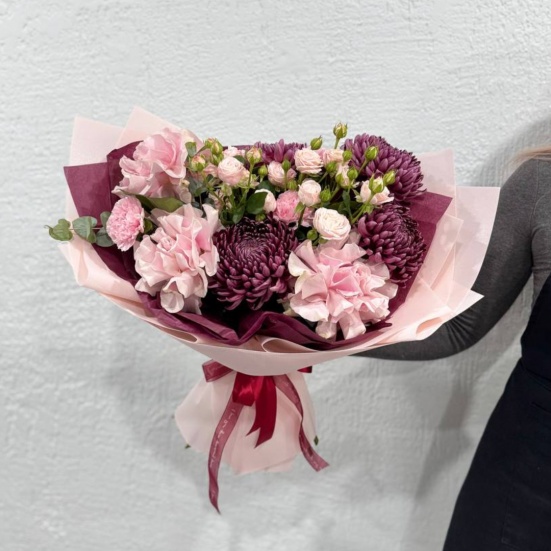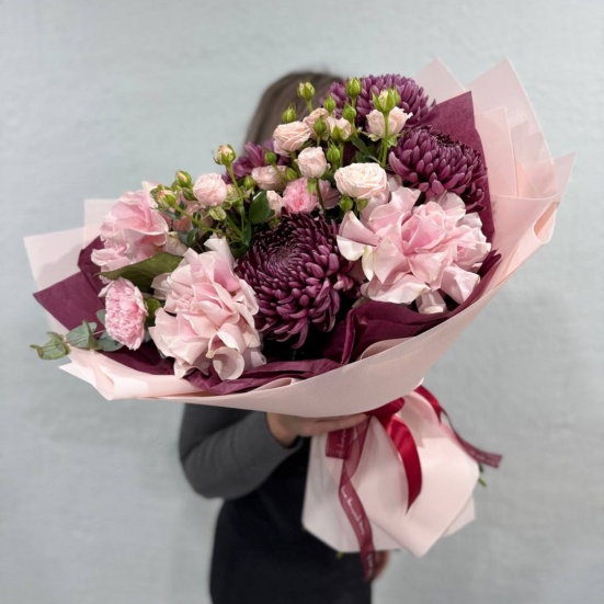 Авторский букет с бигуди-хризантемой, французскими розовыми розами, кустовыми розами и диантусами
